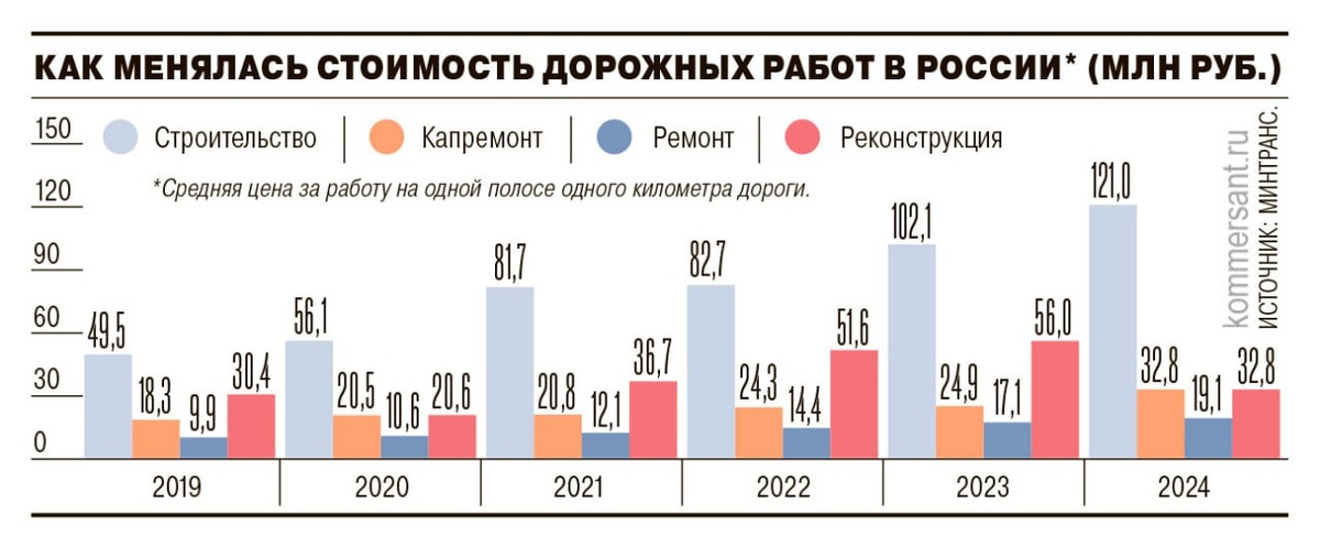 Минтранс России констатировал, что строительство и ремонт дорог в стране существенно подорожали за 2024 год Цена на реконструкцию трассы 4-й категории (без разделителей одна или две полосы) выросла на 73%, а на капитальный ремонт дороги 2-й категории (двух или четырехполосных) — на 36,7%. Самым дорогим видом работ остается строительство трассы 1-й категории (140,6 млн руб. за километровую полосу), самым дешевым — содержание местной дороги (280 тыс. рублей за километр одной полосы).