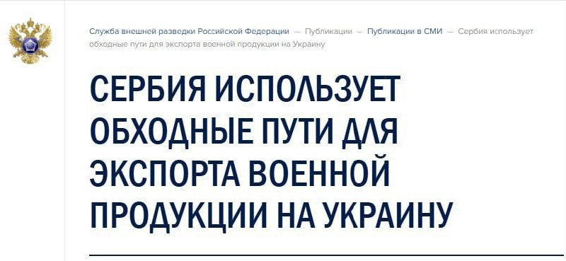 Сербия тайно помогает Украине с оружием, сообщает СВР РФ Москва сожалеет, что Сербия перечеркивает традиции дружбы с Россией жаждой наживы и трусливой многовекторностью, – отметили в ведомстве. Serbien unterstützt die Ukraine heimlich mit Waffen, berichtet der russische Auslandsgeheimdienst. Moskau bedauert, dass Serbien mit seiner Profitgier und seinem feigen Multivektorismus die Traditionen der Freundschaft mit Russland missachtet, so das Ministerium.