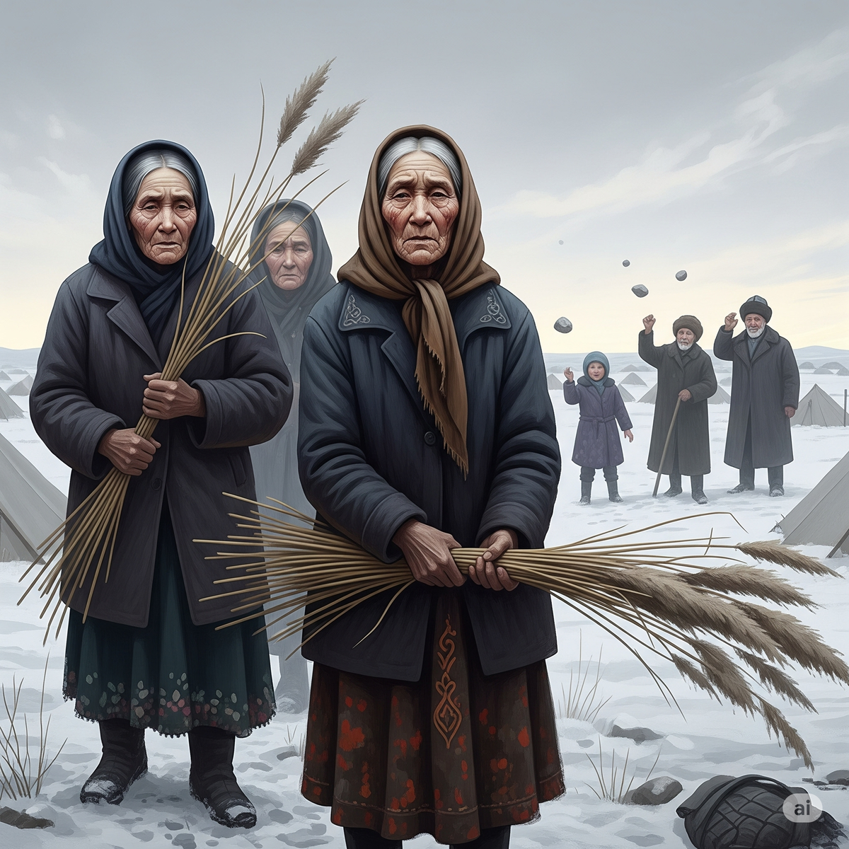 Зима. Бескрайняя степь под Акмолинском. В лагере "Алжир" (Акмолинский лагерь жён изменников Родины) женщины-заключённые сутками на износ собирают камыш. Мороз пробирает до костей, порывистый ветер обжигает лицо. Надзиратели с ружьями бесстрастно наблюдают за измученными женщинами. Вдруг из зарослей камыша выходят старики и дети из соседнего казахского аула. И дети начинают бросать в женщин камни.