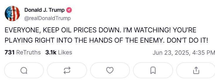 Трамп призвал не повышать цены на нефть «Все, держите цены на нефть низкими. Я слежу! Вы играете на руку врагу. Не делайте этого», — написал американский президент в соцсети Truth Social. Трамп также дал поручение Минэнерго США: «БУРИ, ДЕТКА, БУРИ!!!» — и потребовал исполнить приказ тотчас же. 👍 БайБайден. Подписаться