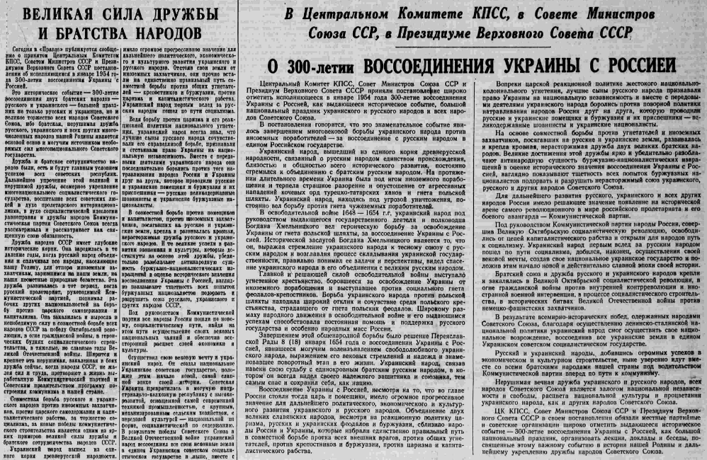 Откроем несвежий номер газеты "Правда" за 9 декабря 1953 года: Жили-были два разных народа, братских, но всё же разных. И вот решили они объединиться - отдельная Россия и отдельная УкраЙна. Богдан Хмельницкий вовсю занимался "процессом складывания украинской государственности". А "лучшие сыны русского народа признавали право Украины на национальную независимость". Ну и так далее. Читать старые агитки - скучно до зевоты. Но ведь десятилетиями это была официальная государственная политика. О "праве наций на самоопределение". Мы эти ленинские лозунги учили прямо с детского сада: Разные народы создали свои национальные государства. И просто живут рядышком, в Союзе, но с правом выхода без условий. Правом не братья воспользовались в 1991 году. Слава Богу, появились нормальные учебники: Мы всегда учили, что 1954 год — это не только запуск процесса передачи Крыма [в состав Украинской ССР]. Это всенародное отмечание 300-летия воссоединения Украины с Россией. И даже под это дело снимались кин