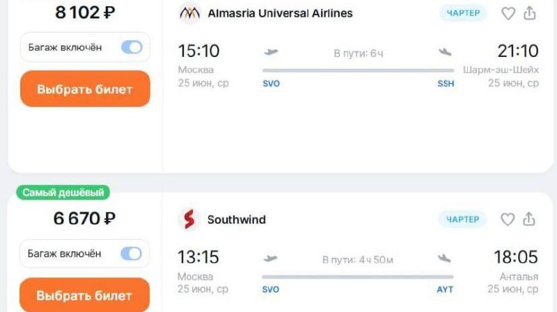 Сезон отпусков в разгаре. Кто планирует, имейте ввиду. Билеты из Москвы подешевели. В Турцию и Египет можно улететь за 6-8 тысяч рублей. Приятного отпуска 😎☀️🤗