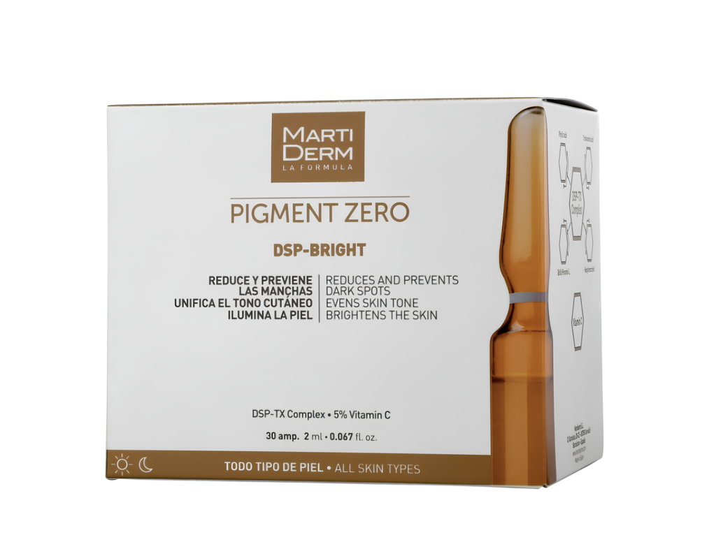 Ампулы Martiderm Pigment Zero DSP-Bright для осветления темных пятен помогают предотвратить и уменьшить проявления темных пятен. Благодаря уникальной формуле, они не только выравнивают тон кожи, но и осветляют и придают сияние.