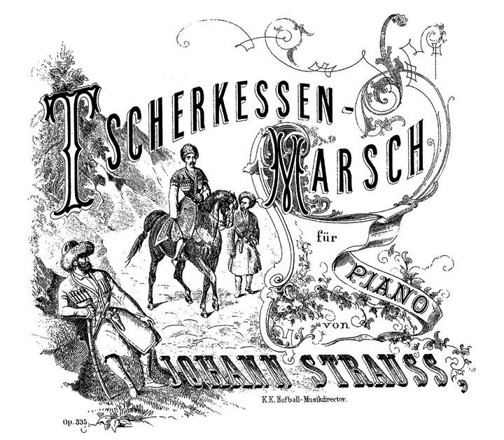 Иоганн Штраус (сын) — «Черкесский марш» (Circassian March), Op. 335 «Черкесский марш» Иоганна Штрауса (сына) предположительно был написан во время его путешествия по России в 1860-х годах. Ноты изданы в 1872 году издательством А. Гутхеля, с печатью русского нотоиздателя П. Юргенсона. Это одно из многих произведений Штрауса, вдохновлённых «экзотическими» темами, популярными в Европе XIX века. Хотя сам Штраус никогда не посещал Кавказ, он использовал общеевропейский интерес к черкесам как символу дикой и благородной воинственности. Сегодня этот марш воспринимается скорее как культурный курьёз — пример того, как Европа романтизировала Кавказ, не зная его реальности. Для черкесской диаспоры такие произведения — напоминание о стереотипах, с которыми они сталкиваются. Если вам интересны аутентичные адыгские мелодии — стоит обратиться к записям ансамбля «Жъыу» или творчеству Зураба Толова.