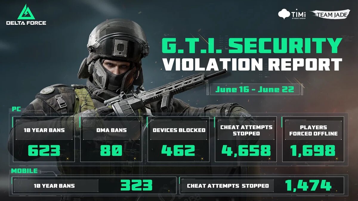 G.T.I. Security отчиталась о результатах недельной работы по обеспечению честной игры в Delta Force. Из этих данных следует, что число злоумышленников сократилось, а как мы уже сообщали ранее, общее число игроков шутера только растет, что указывает на значительное уменьшение процентного соотношения читеров к обычным игрокам. На PC-платформе были приняты следующие меры: На мобильной платформе результаты следующие: Команда разработчиков подчеркивает, что создание честной и дружелюбной игровой среды остается их главным приоритетом. Решительные действия по борьбе с нарушителями показывают серьезность намерений студии в поддержании здоровой атмосферы в игре.