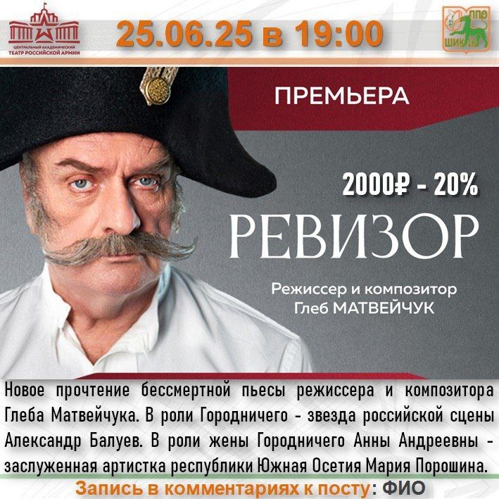 Уважаемые ШИКарные коллеги! ПРОФСОЮЗ СВАО ПРЕДЛАГАЕТ ‼2 билета (на СВАО) на премьеру 📅 25 июня в 19:00 🎭 Спектакль «Ревизор» 🏛 Театр Российской Армии 🤵♂️в главной роли Александр Балуев Постановка Матвейчука. 💰Стоимость: 2000₽ - 20% = 1600₽ 👛 Дотация 20% на каждый билет программе «От спорта к искусству» МГО Профсоюза образования Билеты электронные #Афиша #ОтСпортаКискусству