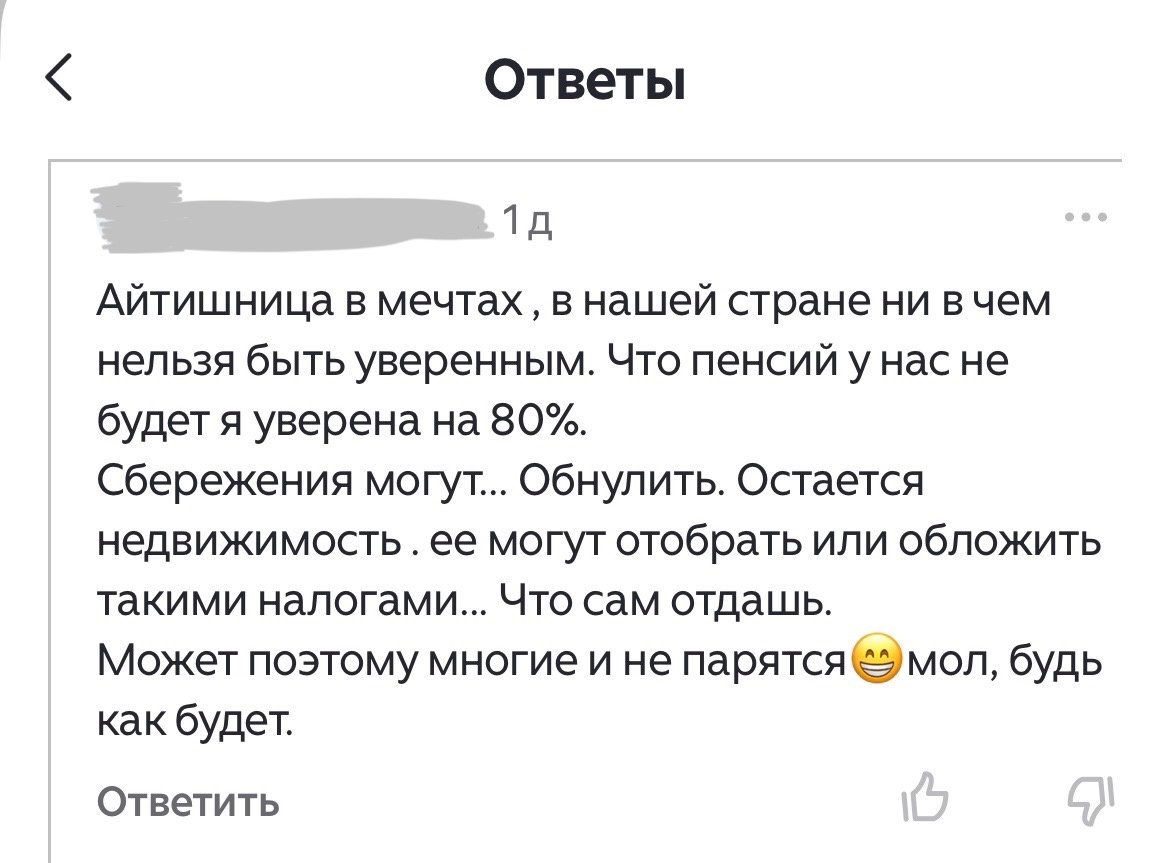 Недавно я оставила комментарий на канале @Вся в долгах на статью про восприятие своего финансового состояния - написала, что для своей сметанки нужно хорошенько грести лапками, и что среди моих знакомых есть люди, которые живут по минимуму, экономят, но ничего не делают ради того, чтобы улучшить свою жизнь. Я не поддерживаю такой взгляд на жизнь, ведь о жизни на пенсии нужно задумываться заранее, чтобы не остаться у разбитого корыта. И на мой комментарий ответил другой подписчик - мол, ничего я не понимаю, квартиры отберут, а накопления обнулят - и многие это понимают, поэтому смирились и тянут свою страдальческую лямку дальше, мол все усилия бесполезны. Другой подписчик написал прямо, что я сама наивность, что очень многие остались на бобах, так как рассуждали так же как я. Но у меня логика простая - если хочешь жить хорошо, то тебе придется поднапрячься. Не бывает такого, что человек сидит, ноет о своей судьбинушке и сразу у него жизнь сама по себе стала налаживаться. Такого не