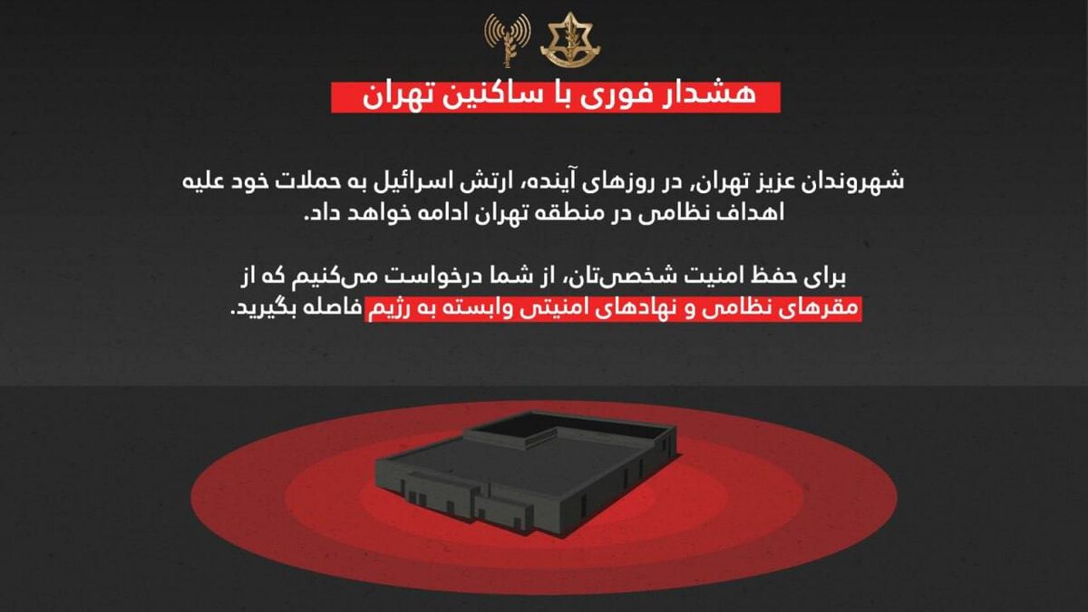 «Уважаемые граждане Тегерана, в ближайшие дни израильская армия продолжит наносить удары по военным целям в районе Тегерана. Ради вашей личной безопасности мы просим вас держаться подальше от центров по производству оружия, военных штабов и учреждений безопасности, связанных с режимом», — говорится в сообщении израильской армии.