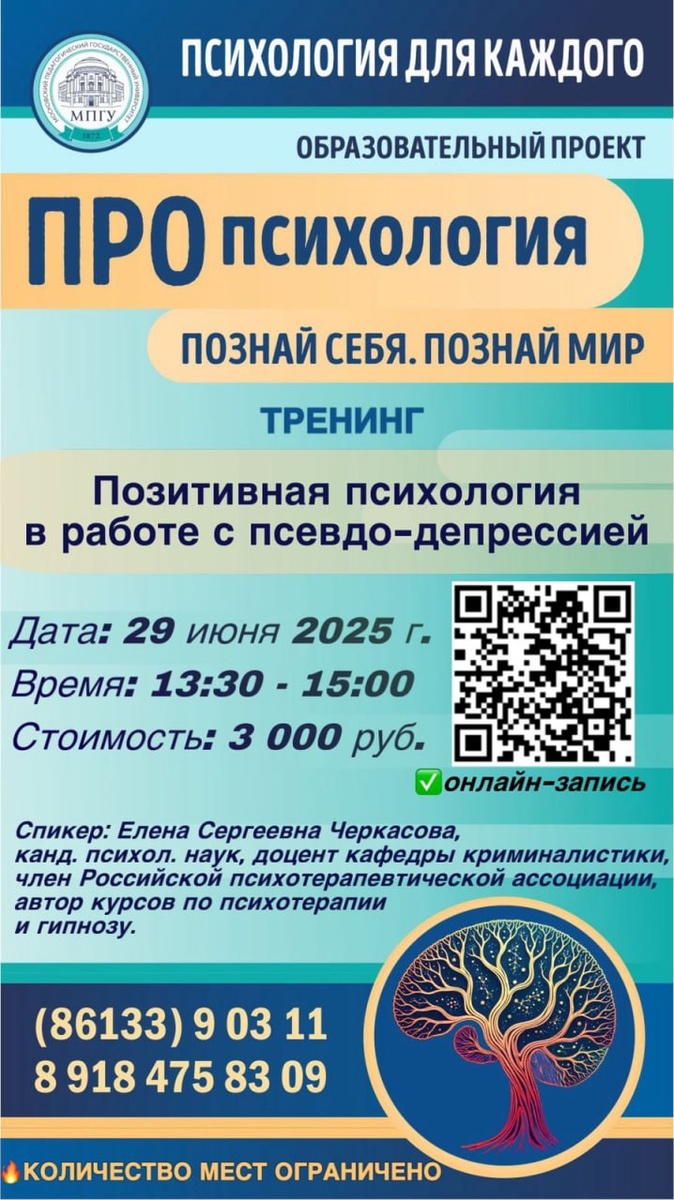 Приглашаем принять участие в психологическом тренинге "Позитивная психология в работе с псевдо-депрессией"🔥🔥🔥🔥🔥в рамках образовательного проекта "ПРОпсихология" 📝Дата и время: 29 июня с 13.30 до 15.00. 💰Стоимость: 3000 рублей. 👩🏻🏫Спикер: Черкасова Елена Сергеевна, кандидат психологических наук, член Российской психотерапевтической ассоциации, автор курсов по психотерапии и гипнозу ❗️ВНИМАНИЕ❗️КОЛИЧЕСТВО МЕСТ ОГРАНИЧЕНО❗️🔥🔥🔥 🙋♀️🙋🏻🙋♂️Запись по ссылке https://forms.yandex.ru/u/6842af9e493639d8a0f7f03e 📞После записи в течении суток необходимо связаться с организаторами и осуществить оплату. 🧠Психология для каждого. Познай себя. Познай мир. 🙋♀️Контактная информация: Центр непрерывного дополнительного образования и инноваций Анапского филиала МПГУ, Астраханская 88, каб. 212. Теллефоны:8-86133-90-311, 8-918-475-83-09. #ПРОпсихология #образование #мпгу #центрдопобразования #анапа #будущее #профессиямечты