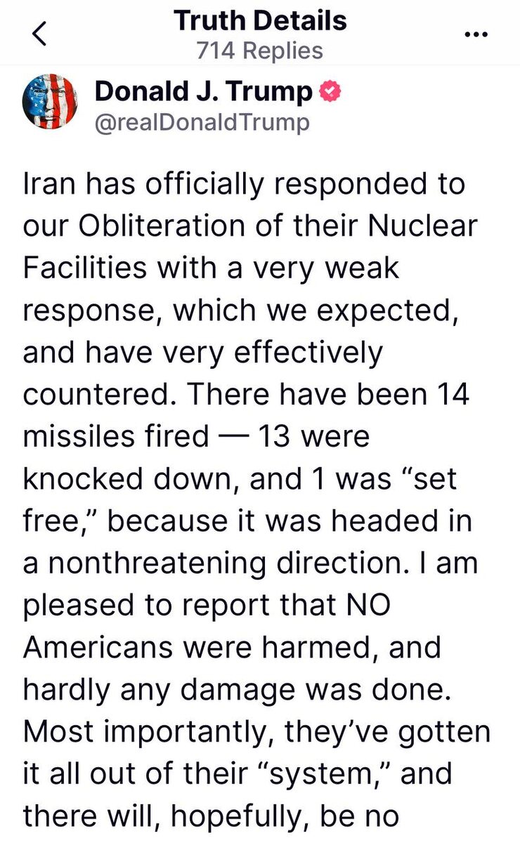 Трамп: «Иран ответил на наши действия по уничтожению его ядерных объектов — очень слабо, как мы и ожидали, и мы эффективно с этим справились. Было выпущено 14 ракет — 13 из них перехвачены, а одна упала на открытой местности. Рад сообщить, что ни один американец не пострадал, ущерб минимален. Благодарю Иран за раннее предупреждение, благодаря которому обошлось без жертв. Самое важное — похоже, они «выпустили пар», и, будем надеяться, волна ненависти на этом закончится. Благодарю Иран за заблаговременное предупреждение, которое позволило избежать жертв и ранений. Возможно, теперь Иран сможет двигаться в сторону мира и гармонии в регионе — и я с энтузиазмом призову Израиль сделать то же самое. Спасибо за внимание к этому вопросу!»