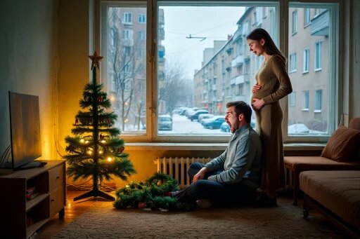 Андрей осторожно поднимал ёлку, стараясь не уколоться о острые иголки. Маша сидела на диване, обхватив руками живот, и молча наблюдала за мужем. Её лицо было бледным, а глаза блестели от невыплаканных слёз.