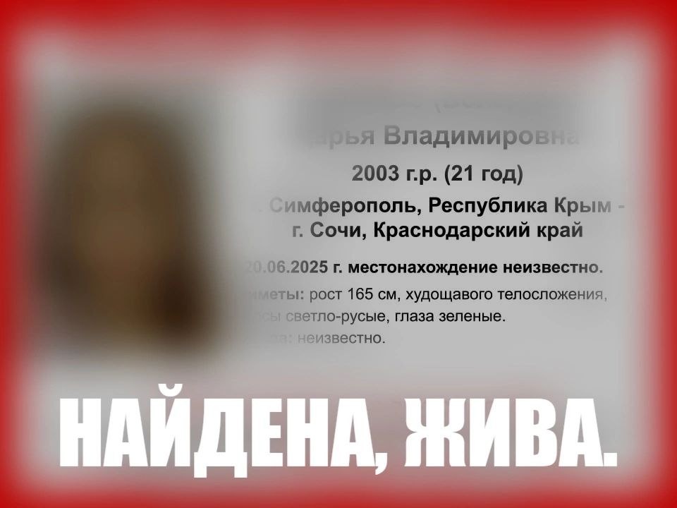 UPD. Найдена, жива. Публикация в рамках межотрядного взаимодействия с ДПСО «#ПоискКрым». Внимание! Пропал человек! #Капинос (Володина) Дарья Владимировна, 2003 г.р., (21 год) г. #Симферополь, Республика #Крым - г. #Сочи, #Краснодарский край С 20.06.2025 г. местонахождение неизвестно. Инфорг поиска: Олеся, 89789647680 Всех, кто обладает информацией о пропавшем, просим сообщить по телефонам бесплатных горячих линий: 88005501054 - ДПО "Юг"; 89785606060 - ДПСО "ПоискКрым" либо 112. Если вы готовы помогать в поиске пропавших без вести, приглашаем присоединиться к телеграмм-чату оповещения: t.me/poisk_193