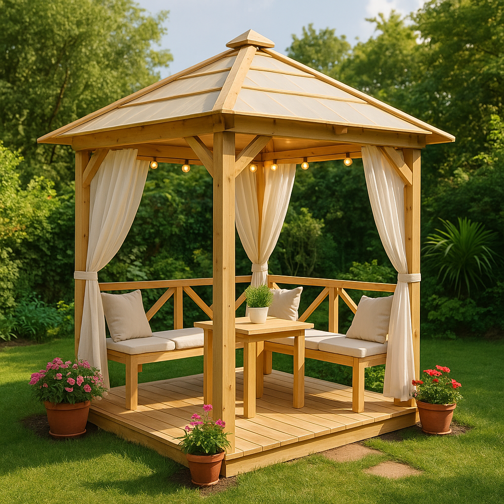 Основа — залог надёжности. Для простоты используйте бетонные блоки или винтовые сваи. Установите по уровню в углах и по центру сторон. Совет: делайте точную разметку — проще выровнять сразу, чем потом переделывать. Из бруса собираем вертикальные стойки и верхнюю обвязку. Обязательно проверяйте уровень и диагонали — чтобы беседка не «поехала». Добавьте диагональные укосины для жёсткости. Внизу — лаги пола. Идеально подойдёт четырёхскатная или простая двускатная крыша. Смонтируйте стропила, закрепите обрешётку и настелите кровельный материал. Выбор крыши: Настелите доски на пол, зашлифуйте и покройте лаком или краской. Можно добавить перила или решётки по бокам. Затем — самое приятное: украсьте беседку! Всё это превращает обычную постройку в атмосферное место для отдыха. Райская беседка — это не сложно, если делать с душой. Потратив 2–3 выходных, вы создадите уголок, куда захочется возвращаться снова и снова.