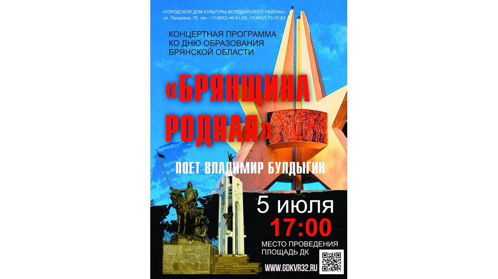 5 июля на площади Городского Дома культуры Володарского района состоится концертная программа ко Дню образования Брянской области «Брянщина родная». Начало в 17:00. Свои музыкальные композиции зрителю подарит наш земляк Владимир Булдыгин. Брянская область была образована 5 июля 1944 года, выделена из районов Орловской области. За прошедший период проделана огромная работа, выросло новое поколение людей, города и поселки области живут и развиваются. Сегодня Брянская область — это регион передового сельского хозяйства, многоотраслевой промышленности, активного строительства и развитой социальной инфраструктуры. 6+ В Брянске концертами отметят годовщину образования области