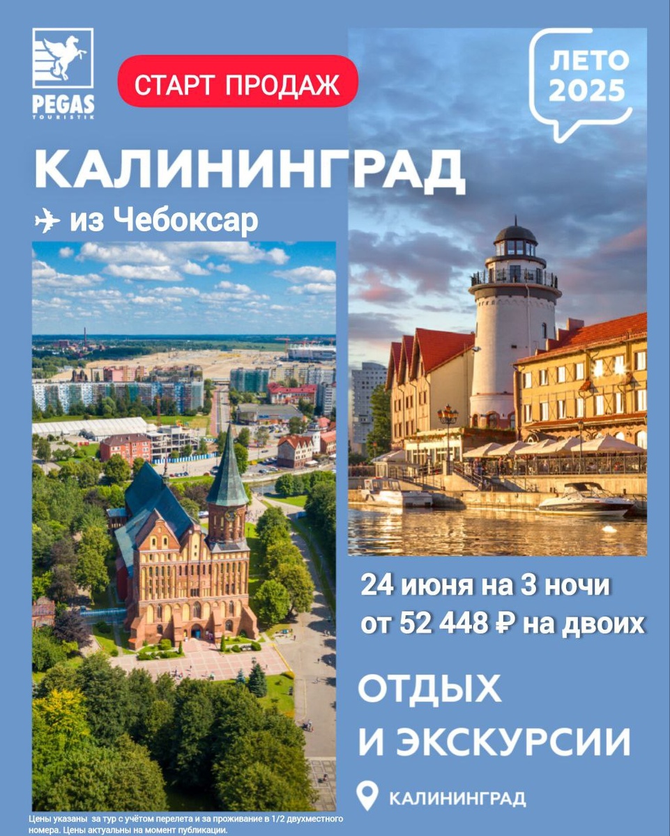 ✈️ В Калининград из Чебоксар! Рады сообщить вам, что мы открыли бронировние туров в Калининград с вылетом из Чебоксар! - Частота рейсов: 2 раз в неделю, во вторник и в пятницу - Перелеты: GDS (Аэрофлот) 👌 Доступны для бронирования пакетные туры: ✔️ Калининград (выбор экскурсий в допуслугах) ✔️ Калининград: Калининград+ побережье Туры в Калининград из Чебоксар на мгновенном подтверждении: 24 июня на 3 ночи от 26 224 ₽ 1/2 DBL 27 июля на 4 ночи от 30 136 ₽ 1/2 DBL 1 августа на 7 ночей от 52 708 ₽ 1/2 DBL 📍 В стоимость тура входит перелёт и проживание. Цены динамические и не фиксируются до оплаты и выписки билетов.