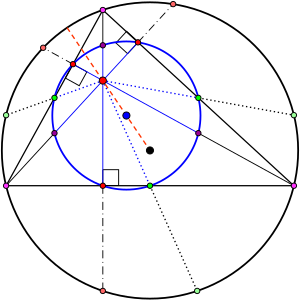 Один из увлекательных фактов геометрии - окружность девяти точек (и рядом с ним прямая Эйлера). Окружность девяти точек проходит через середины трёх сторон треугольника. "Основания трёх высот произвольного треугольника (3 точки), середины трёх его сторон (3 точки) и середины трёх отрезков, соединяющих его вершины с ортоцентром (3 точки), лежат все на одной окружности.". И этот "закон" справедлив для любого треугольника. Окружность девяти точек является описанной окружностью для следующих трёх треугольников: Пусть O — центр описанной окружности треугольника ABC, M — точка пересечения медиан, H — ортоцентр (точка пересечения высот треугольника). Тогда точки O, M и H лежат на одной прямой (Эйлера), причём OM:MH=1:2. Поскольку тут одних только интересующих нас точек 9, а дополнительных построений и того больше, поэтому хочется это всё точно и наглядно представить. Например, можно удобно сделать в Geogebra. В Геогебре можно как угодно менять размеры исходного треугольника и наблюдать инв