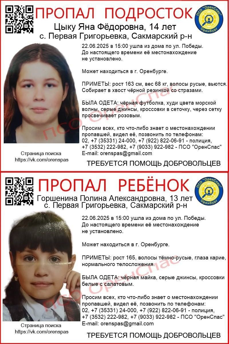 В ответ на пост К вечеру 23 июня зона поиска двух школьниц в Сакмарском районе увеличена на 20 км. Семь дронов обследуют территорию. Поисковики проверяют заброшенные здания, поля и соседние села, проводят подомовой обход. Рассматриваются несколько версий пропажи. Полиция и ПСО «ОренСпас» проверяют поступающую информацию, часть сведений не подтвердилась.