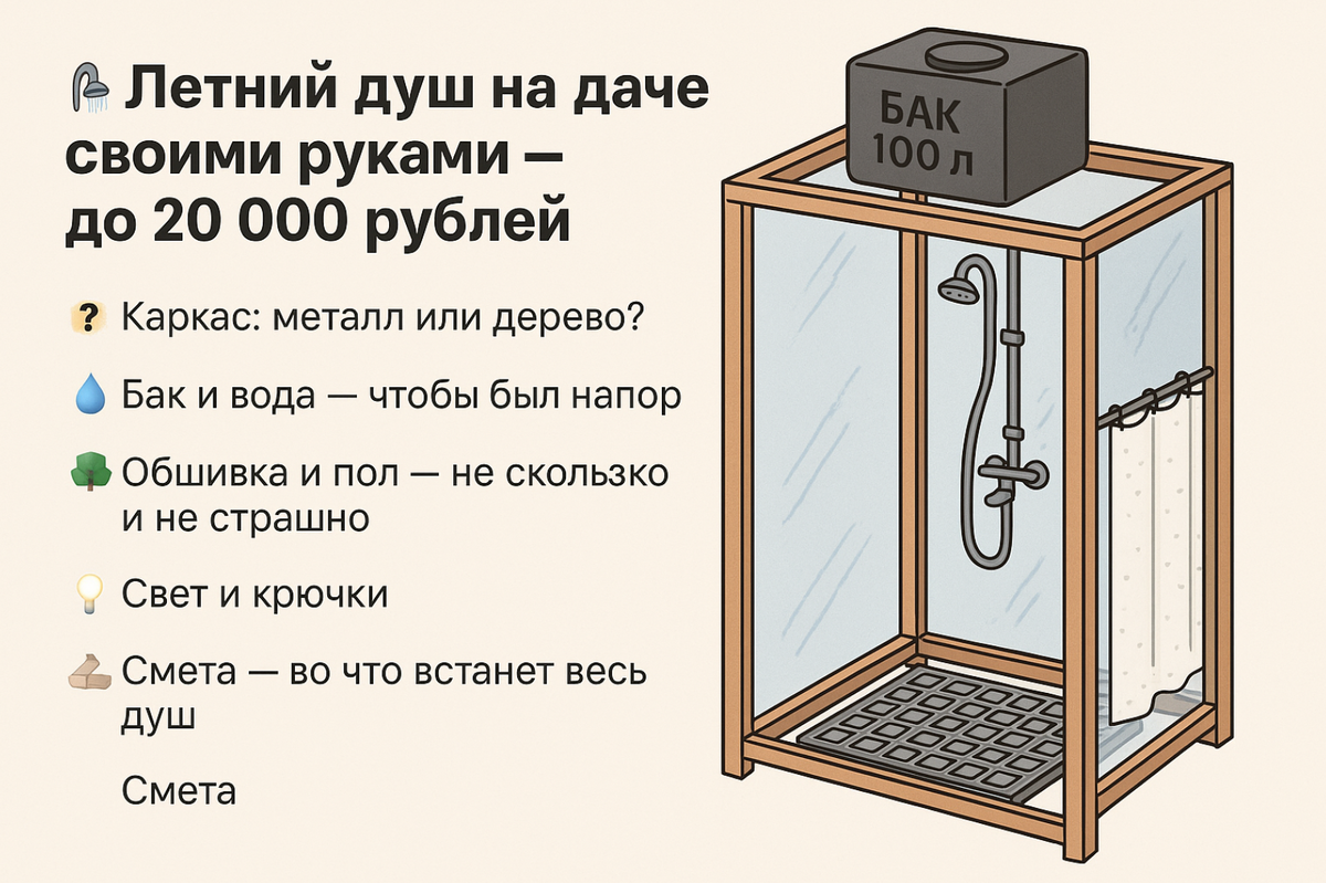 🧮 Смета — во что встанет весь душ Вот честно: покупать душевую кабину на дачу за 60–80 тысяч — это не дача, а выставка сантехники. Мы сделали комфортный душ за 18 400 ₽ — с баком, обшивкой, полом и светом. Без сварки и экзотических материалов. Вот как. Если душ стационарный — лучше металл. Если на 2 сезона — дерево подойдёт. Наш вариант: брус 50×50 + пропитка + уголки. Всё собрано как конструктор. Стоимость — 4200 ₽. А если хочется надолго и по уму — профильная труба 20×40 мм, покрасить грунтом, собрать на болтах или сварке. Никаких черных бочек на крыше, которые прогреваются до кипятка.