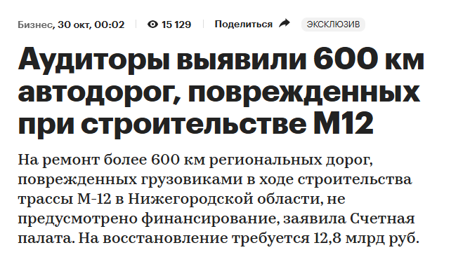 Продление скоростной магистрали М-12 «Восток» до Тюмени должно было стать одним из флагманских инфраструктурных проектов страны. Однако параллельно с возведением трассы возникла проблема, которую, кажется, не предусмотрели: региональная дорожная сеть, по которой шли сотни грузовиков со стройматериалами, оказалась буквально повреждена. Теперь в Нижегородской области требуется восстановить более 600 километров региональных и межмуниципальных дорог. Цена вопроса — 12,8 млрд рублей. Финансирования нет. Сроки непонятны. Как так получилось? Строительство федеральной трассы — проект большого масштаба. Чтобы обеспечить стройку щебнем, песком, бетонными изделиями и металлоконструкциями, перевозчики использовали существующие региональные дороги. Именно на них легла вся тяжесть строительной логистики: многотонные грузовики проходили по маршрутам годами, тогда как эти дороги не были рассчитаны на подобные нагрузки. Итог: десятки участков получили повреждения, часть полотна требует капитального рем
