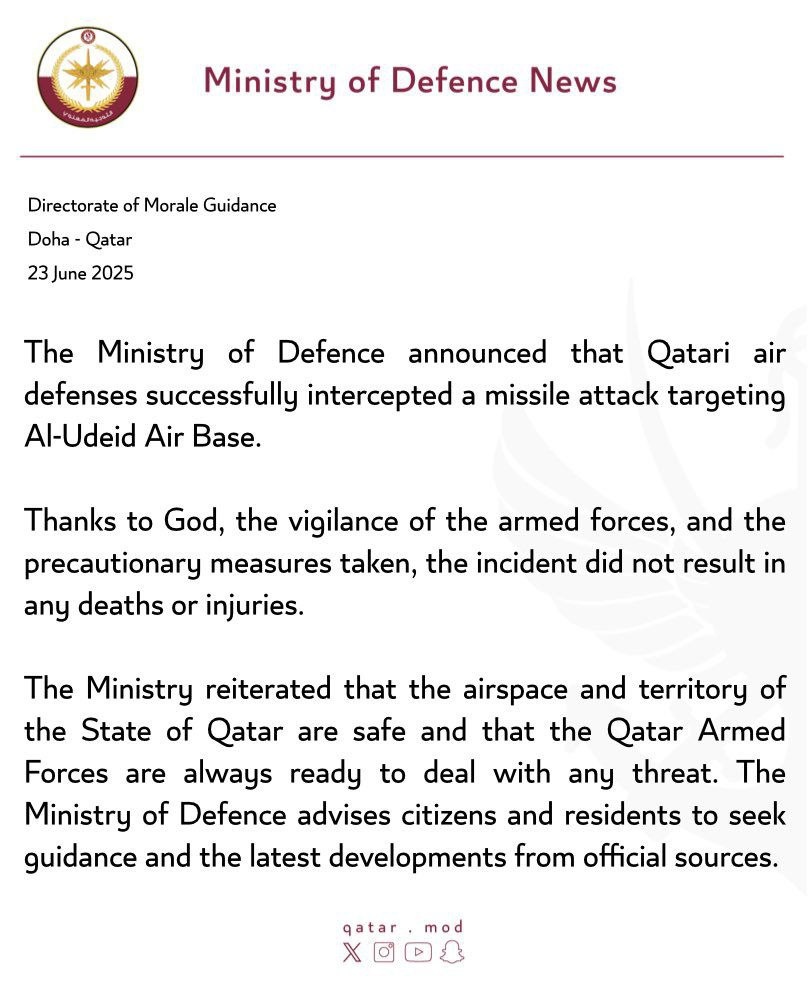 🇶🇦❗️🇮🇷 МИД Катара назвал ракетную атаку КСИР по базе "Аль-Удейд" "нарушением суверенитета и воздушного пространства Катара, а также