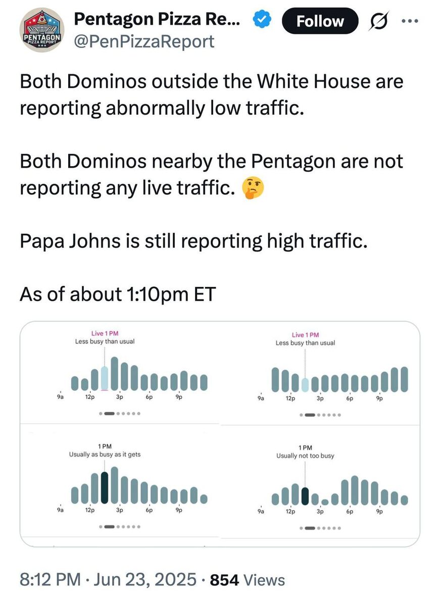 ⚡️ Пентагон опять заказывает пиццу — инсайдеры снова сообщают об аномальной активности в ближайших пиццериях Papa John's