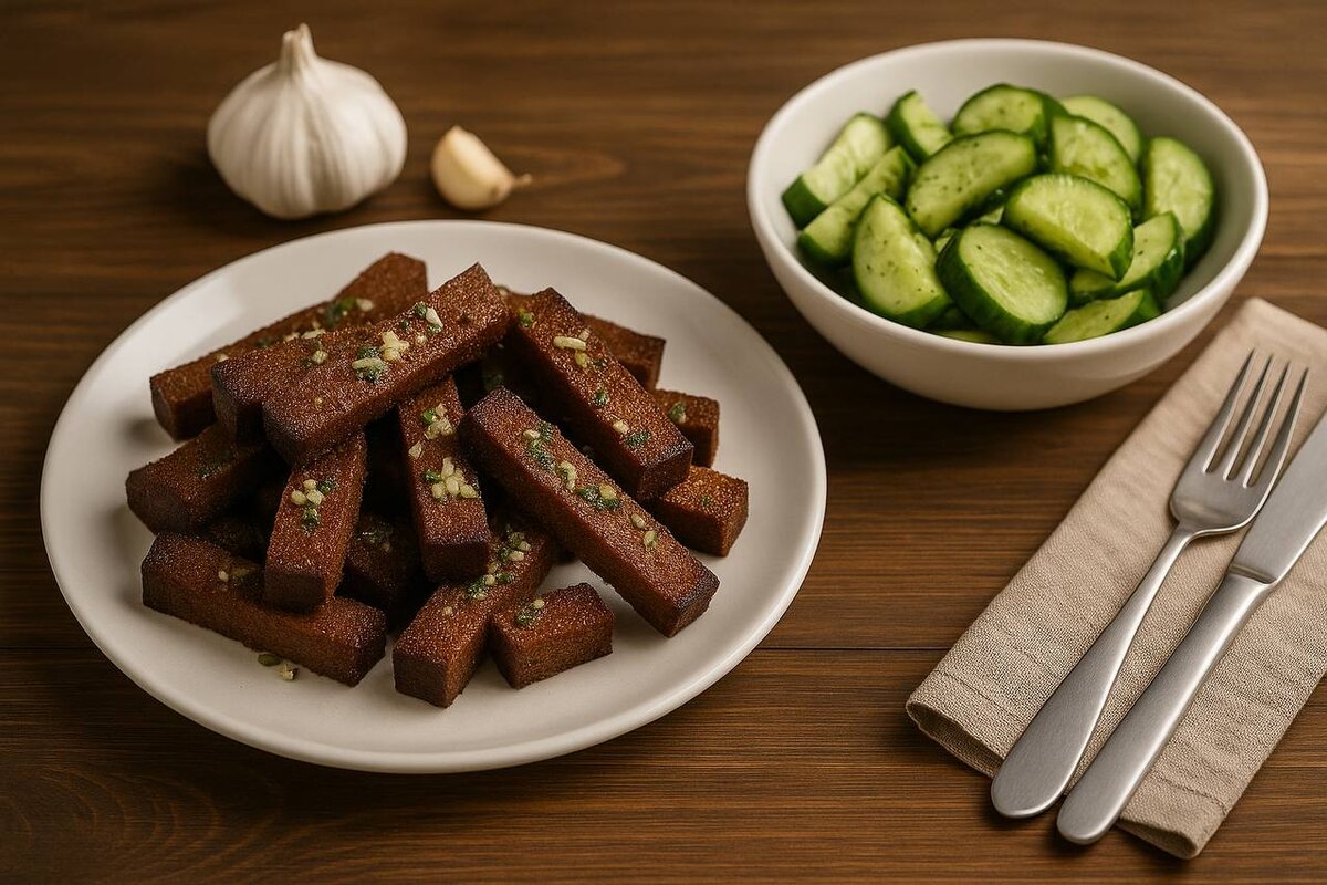 Это не тот ужин, который про пользу и детский аппетит. Это скорее про вечер, когда хочется чего-то по‑взрослому вкусного — с ароматом чеснока, с хрустящей корочкой и лёгкой свежестью. Мы готовим это, когда не хочется суеты, а хочется фильм, уют, вкусный напиток и тёплую компанию. Гренки и салат — сочетание, которое никогда не подводит. Особенно когда готовишь с настроением. Ингредиенты (на 6–8 порций): Для чесночных гренок: • Чёрный хлеб (лучше ржаной или бородинский) — 10–12 ломтиков • Чеснок — 4–5 крупных зубчиков • Сливочное масло — 3 ст. л. • Растительное масло — 2 ст. л. • Соль — по вкусу • Молотый чёрный перец — щепотка • Свежий укроп — для посыпки (по желанию) Для огуречного салата: • Огурцы — 5–6 средних • Укроп — половина пучка • Оливковое масло — 2 ст. л. • Лимонный сок — 1 ст. л. • Соль — по вкусу • Чёрный перец — немного, для баланса Пошаговое приготовление 1. Подготовим хлеб Нарезаем чёрный хлеб ломтиками средней толщины — не слишком тонко, чтобы не пересушился. Подсушива