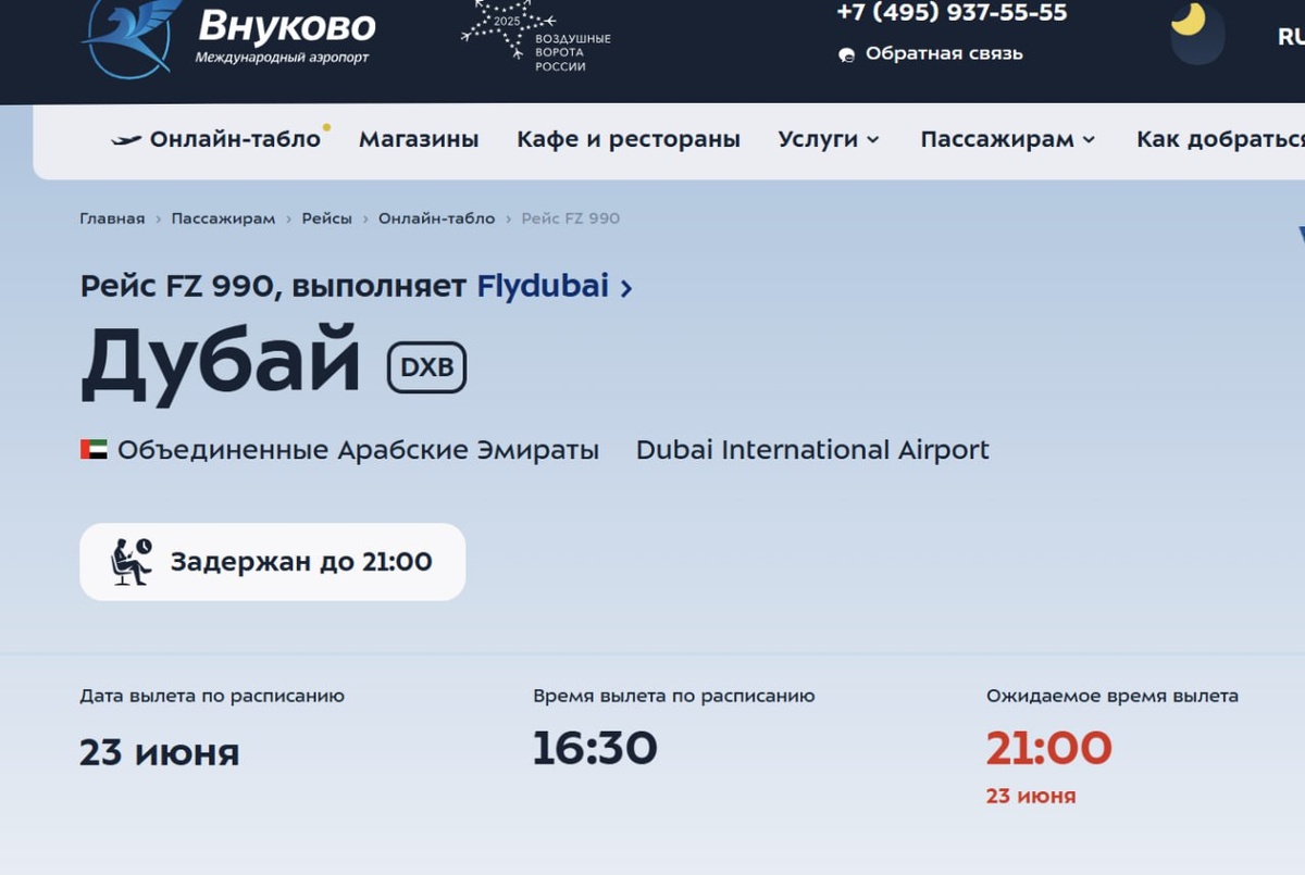 Борт Emirates EK 134 вылетел в Дубай из Домодедово в 18:55 вместо 18:15. Ожидается, что EK 131 прибудет в Москву по расписанию в 22.45, сейчас он в пути.