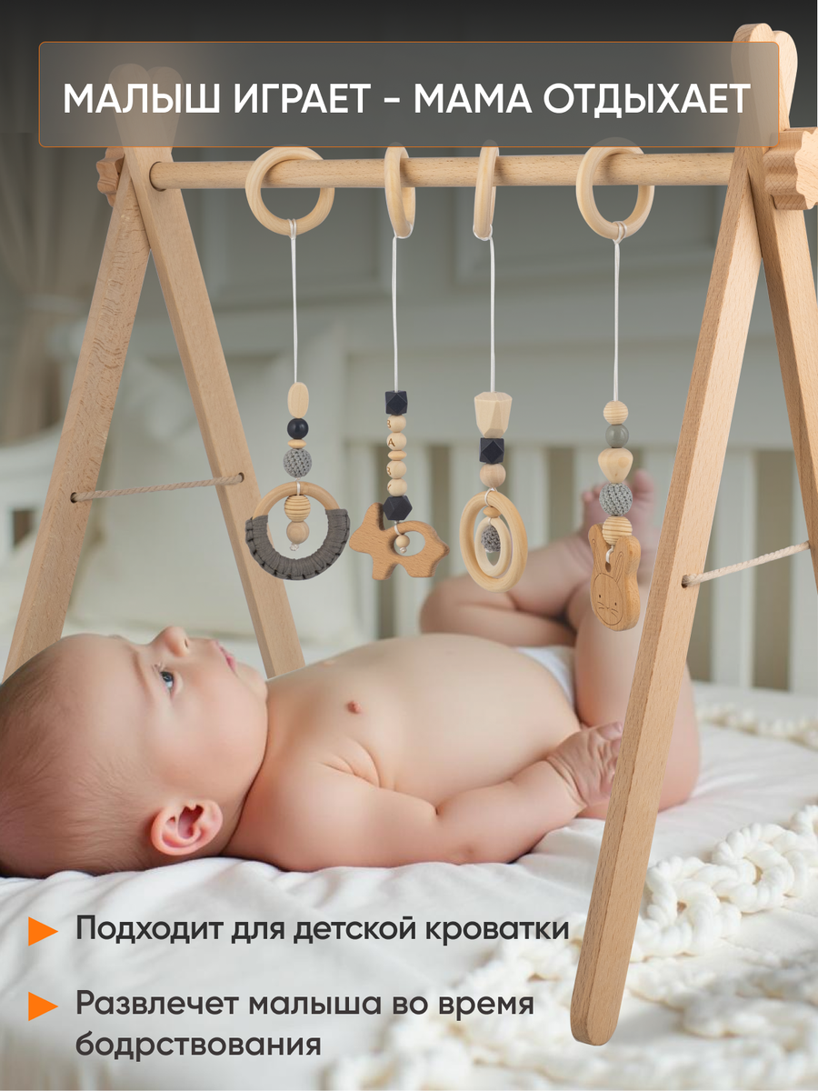 ✔ Развитие через практику — вместо игрушек используются специальные материалы. Главный принцип: "Помоги мне сделать это самому". Классическая Монтессори-среда делится на зоны: 🔹 Пример Монтессори-материала: Мобиль-стойка для развития концентрации ✔ Организуйте низкие полки с материалами