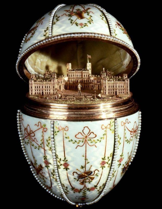 Вопрос про яйца. Пасхальные яйца фирмы Фаберже. Здесь не подсказка, на фото, а просто яйцо, которое изготовил мастер Перхин со своей артелью. «Гатчинский дворец», так оно называлось. Дворец воспроизведен с удивительной точностью, даже маленький император Павел стоит, повернувшись к своему плацу😍