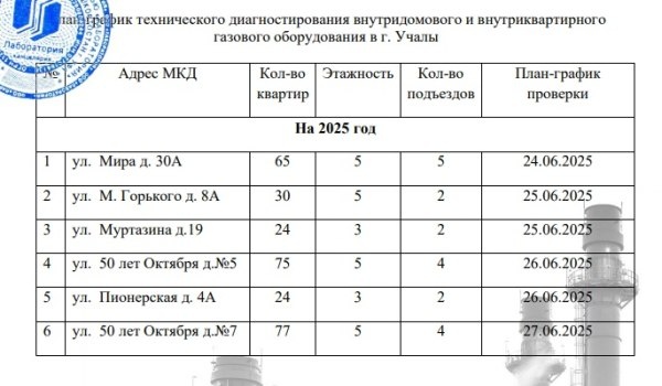 ООО «УК «Служба заказчика» сообщает, что с 24 июня 2025 года специализированная организация ООО «Лаборатория» проводит работы ПО ТЕХНИЧЕСКОМУ ДИАГНОСТИРОВАНИЮ ВНУТРИДОМОВОГО И ВНУТРИКВАРТИРНОГО ГАЗОВОГО ОБОРУДОВАНИЯ в многоквартирных домах г. Учалы, в целях проверки безопасности газопровода в связи с истечением срока его безопасной эксплуатации. Работы осуществляются сотрудниками ООО «Лаборатория» с утвержденным план-графиком. Убедительная просьба, обеспечить доступ в Ваши квартиры. Источник https://uchaly102.ru/?p=88695