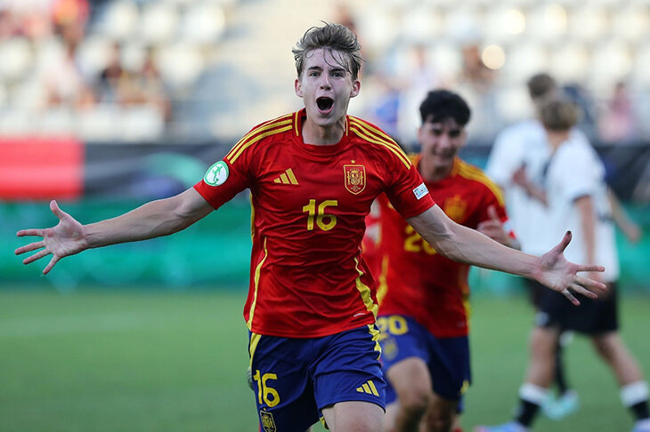 Безумие. Сборные Испании и Германии устроили праздник в полуфинале Евро U19: покер, хет-трик, несколько голов на 90+, а в итоге – 6:5! Испания на 90+ и проигрывала, и выигрывала – в итоге ушли в дополнительное время. Там команды забили 5 голов Турнир проходит в Румынии, участвуют восемь сборных. В полуфиналах встретились Испания и Германия, а еще Румыния и Нидерланды. Матч испанцев и немцев вышел просто невероятным. ● До 61-й минуты сохранялся минимальный счет 1:0 в пользу немцев: повели после гола Макса Морстедта, а голкипер Константин Хейде вытащил пенальти от Антонио Кордеро. ● Дальше прямым ударом с углового забил Пабло Гарсия! Но немцы ответили на 78-й в контратаке и повели 2:1 ближе к концу основного времени. ● На 90-й минуте вероятность победы Испании составляла 1,8%. Но это практически случилось: Гарсия забил еще два мяча на 90+1 и 90+5, оформив хет-трик – 3:2 в пользу Испании! Оставалось дотерпеть совсем чуть-чуть, но испанцы сами себе устроили проблемы. ● На 90+9 навес в испа