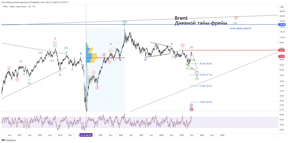 #Brent Несмотря на высокую волатильность в нефти в последние дни на фоне обострения конфликта между Израилем и Ираном, нефть по-прежнему имеет все шансы на снижение в ранее обозначенный диапазон. Сейчас поставлена вторая волна (ii) Конечной диагонали в [c] of Y of (X), ожидаю продолжение снижения в (iii) of [c] of Y of (X) на обновление низов апреля 2025. Youtube: https://youtu.be/DyRp5DMc2nI RuTube: https://rutube.ru/video/3467ba55d546c36d4a9d97191c1afbee/ VK video: https://vkvideo.ru/video-229986162_456239067 Dzen: https://dzen.ru/video/watch/68599a5d64661b719218739f Не является ИИР 💪 Бот Закрытого Канала