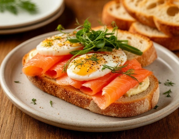 Для добавления изысканности попробуйте бейгл с копченым лососем и яйцом на завтрак. Яичница со свежим укропом, копченым лососем и намазкой из крем-сыра на поджаренном бейгле станет вкусным вариантом бранча с высоким содержанием белка, идеально подходящим для летнего утра.