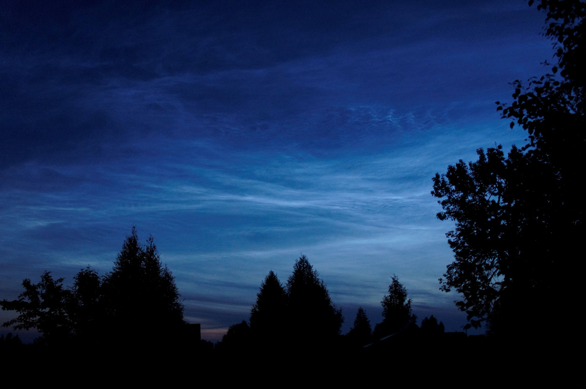 Итак, у меня снова появилась техническая возможность грузить фото, поэтому есть смысл вернуться к блогу на "Дзене" и выпускать здесь статьи и посты хотя бы для своей памяти. Потому что фото - это как раз во исполнение народной мудрости "Лучше один раз увидеть, чем сто раз услышать". Хотя, например, если представить себе Паустовского или Пришвина, ведущих свои блоги в соцсетях с фото- и видеосъёмкой - как знать, получили ли бы мы те самые любимые тексты? Или записи типа "Рыбалка на Мещоре, много фото, огромные лещи!" и "Охота с собакой, уникальное видео, секреты дрессировки"? К счастью, это уже так и останется неизвестным. Итак, возвращаемся к летней атмосфере севера Пошехонского района Ярославской области. Я не Паустовский, мне проще показать. Это серебристые облака. Предсказать их появление, насколько я знаю, невозможно, потому что оно зависит от процессов, происходящих уж очень высоко над землёй - до 80 км. Бывает, и небо ясное, а ни одной серебристой прядки нет, а бывает, что и обыч