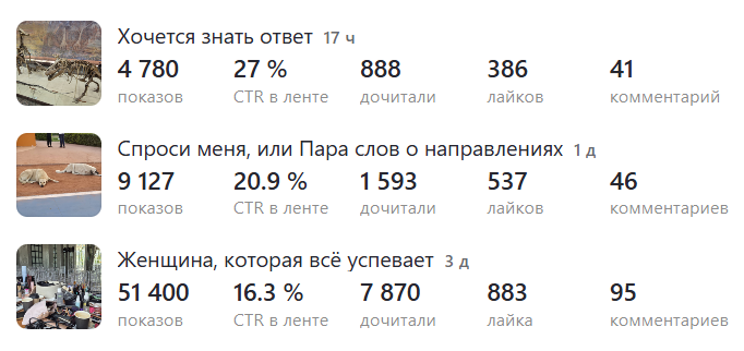Я в который раз недоумеваю: это Дзен формирует такую политику и не "крутит" - назовем их так условно - культурологические посты? Или платформа анализирует активность первых 100-150 читателей, видит, что они не дочитывают, не лайкают, закрывают текст - и только тогда перестает его показывать? Ну, посудите сами. Статистика поста про Палеонтологический музей и поста про женщину в маникюрном салоне.