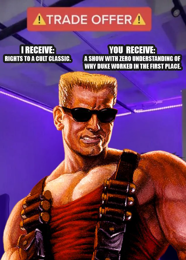 Я получаю: права на культовую классикуВы получаете: шоу с отсутствием понимания, почему Duke Nukem выстрелил изначально Ади Шанкар в ответ написал, что разработчикам не понравится то, что они увидят: Мне заранее жаль плакс из Apache Software (создатели Duke Nukem 3D).Я заранее приношу им свои извинения… … Но вам не понравится то, что я собираюсь сделать с Дюком Нюкемом Ади Шанкара: