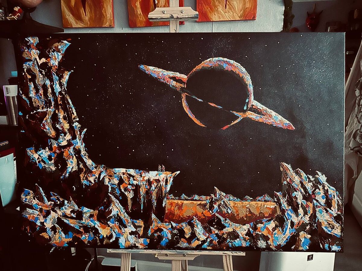 Прям тянет меня в черное что-то… Это братульцу рисовал, по мотивам старой советской картины из документального фильма про Циалковского. Растянул рисование на год почти… Исключительно мастихины #мое