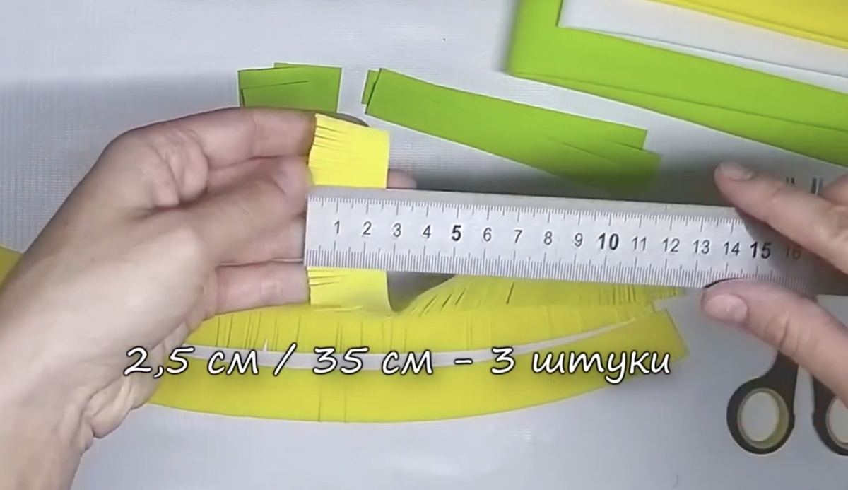 Из жолтого фоамирана нарезаем три полоски и делаем из нее вот такую бахрому, не доходя до края 5-6 мм. (Размеры и количество отрезков указаны на фото)