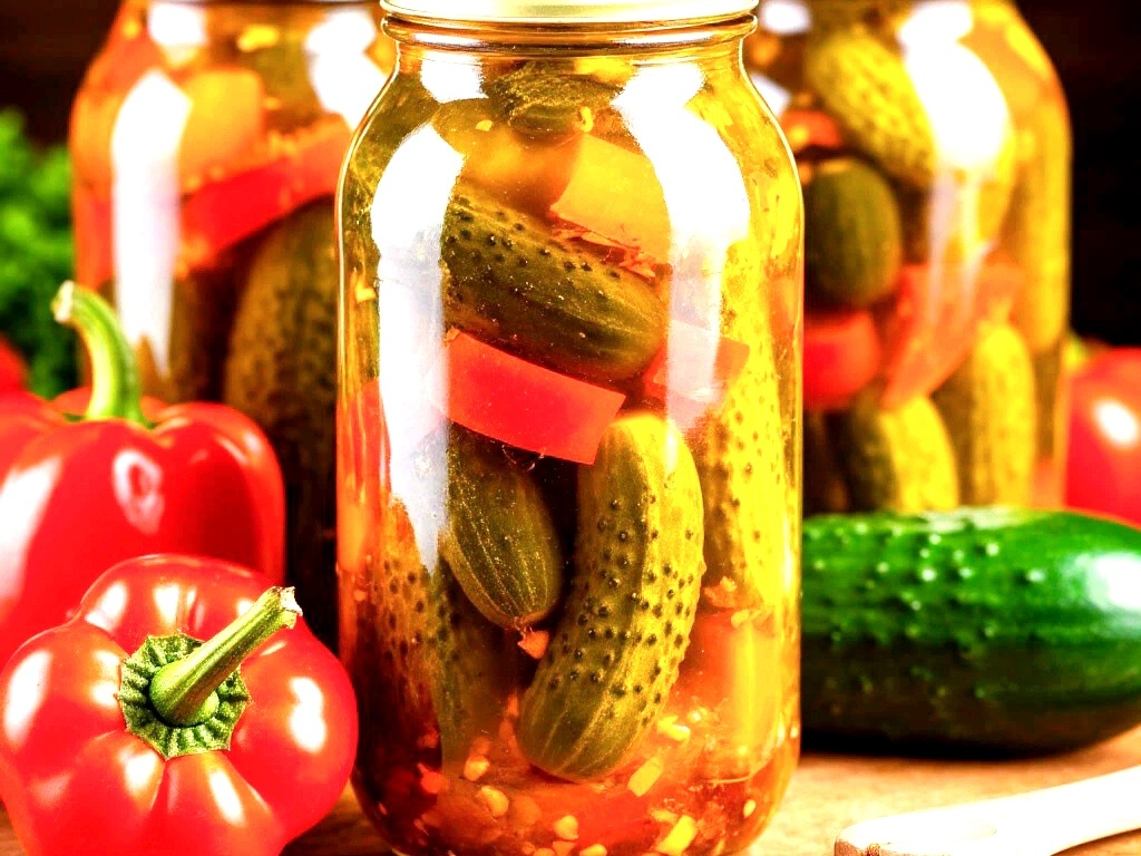 Данный рецепт "Огурцы по-болгарски с перцем" рассчитан на три трехлитровые емкости: Состав: Для маринадной заливки (на полтора литра воды): Метод приготовления: Подготовка овощей: Огурцы промойте и выдержите в ледяной воде несколько часов, это сделает их более хрустящими. У перцев удалите сердцевину с семенами, нарежьте крупными полосками или дольками. Подготовка тары: Проведите стерилизацию трехлитровых банок и крышек. На дно каждой подготовленной банки поместите чеснок, лист лавра, перец горошком и душистые травы, если используете. Уложите огурцы в банки как можно плотнее, переслаивая их кусочками сладкого перца. Вскипятите воду, добавьте соль и сахар, помешивайте до полного растворения. В конце добавьте уксус 9%. Залейте кипящим маринадом огурцы в банках. Накройте крышками и закатайте. Переверните банки вверх дном, укутайте теплым одеялом и оставьте до полного остывания. Храните в прохладном и темном месте. После остывания убедитесь, что крышки плотно прилегают к банкам.