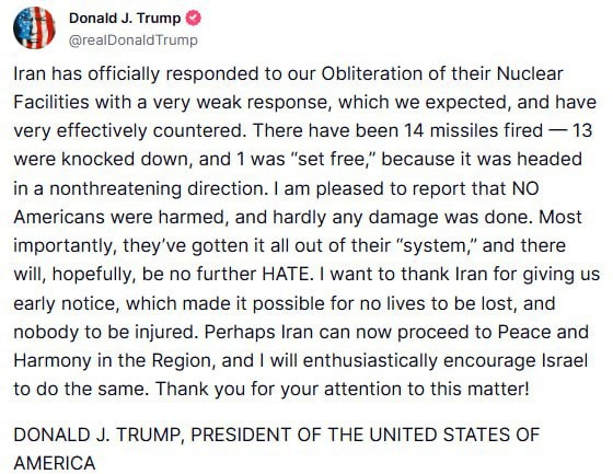 Трамп назвал ответ Ирана слабым Он заявил, что никто из американцев не пострадал в результате иранских ударов по американской авиабазе в Катаре. Президент США допустил, что теперь Тегеран «сможет добиться мира и гармонии в регионе», и пообещал «с энтузиазмом призывать Израиль сделать то же самое». 👍 БайБайден. Подписаться
