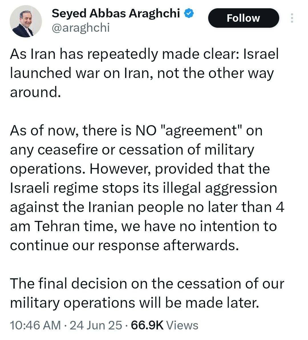 However, provided that the Israeli regime stops its illegal aggression against the Iranian people no later than 4 am Tehran time, we have no intention to continue our response afterwards’