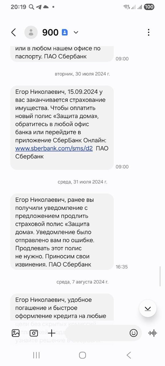 Даже после того, как я выяснил, что меня штрафуют каждый месяц на круглую сумму, никакой информации найти об этом невозможно ни в приложении Сбербанка, ни в "Домклике" (их сайте). Решил проверить сообщения с номера 900, вроде все читаю с этого номера, но мало ли что-то пропустил важного от любимого банка. Обнаруживается, что они вводили меня еще больше в заблуждение: на скрине видно, что единственное, что прислал банк по поводу страховки, — что она заканчивается, а потом что ошибка, продлевать не нужно, все ок. Банк на моих (и не только) штрафах бьет новые рекорды по выручке. Почту и "Домклик" просмотрел тоже — информации, уведомлений и просьб, что им не хватает страховки или что меня штрафуют, ничего этого нет, но и, естественно, когда звонил, банк только кредитки предлагал.