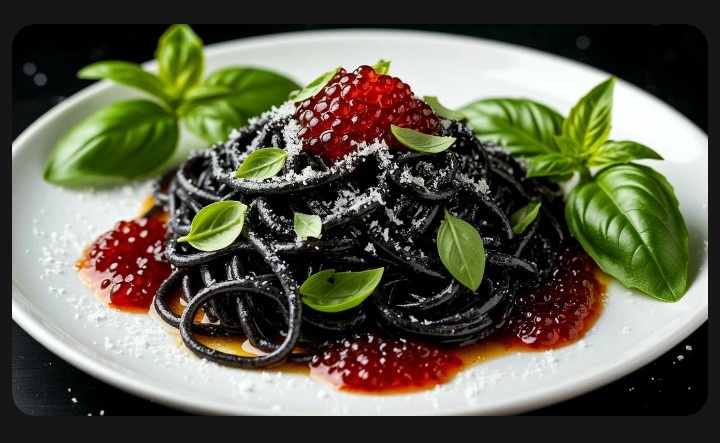 Получается не только вкусно, но и визуально потрясающе. Паста с чёрными чёрнилами и рисом создаёт иллюзию галактических звездных туманностей. Икру можно использовать как космические планеты, а серебряные блёстки добавляют сияния — словно ты на ужине на межгалактическом космическом корабле!