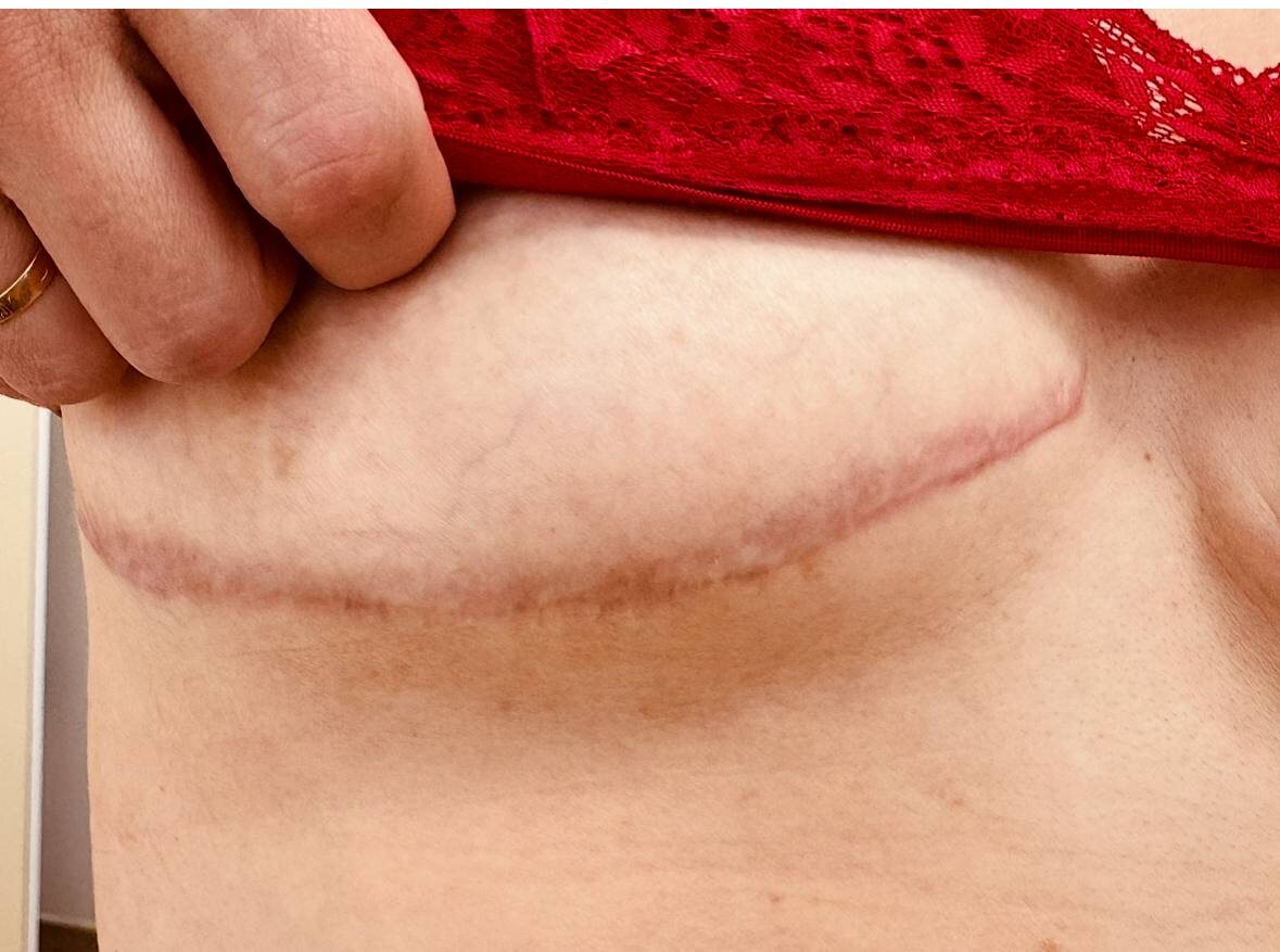 Была сделана операция по уменьшению груди, рубец на одной груди зажил быстро и не беспокоил, а с другой - партнерской правой стороне рубец беспокоил, не заживал долго и сейчас он значительно отличается от рубца на другой груди.