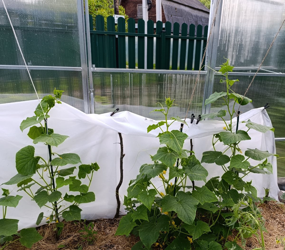 Термометр на веранде показывает всего +13 градусов. В пасмурную погоду солнце не нагрело воздух в теплице, там всего +16. Растения закаляются!