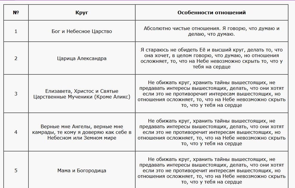 Во главу угла я поставил Бога, Небесное Царство и Царицу Александру. В основе всего лежит принцип не обижать их. В следующем кругу Елизавета и Святые Царственные Мученики. Главная разница между кругами, что я не должен выдавать тайны вышестоящих, нижестоящим. Если кто-то из вышестоящих нарушит Закон Евангелия, главное для меня не обидеть вышестоящего, а не сам факт нарушения. Впервые в истории я признал священной не Закон Евангелия, а иерархию поставив её выше Закона. Теперь в случае нарушения Закона, я имею право, лишь высказать точку зрения не обидев человека. Иерархия признана вечной.