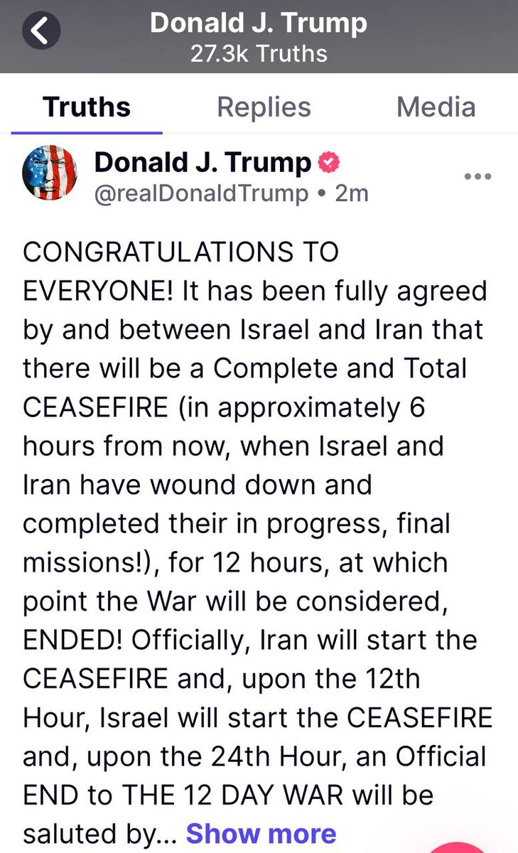 Трамп написал: ПОЗДРАВЛЯЮ ВСЕХ! Достигнута полная договорённость между Израилем и Ираном о ПОЛНОМ И ОКОНЧАТЕЛЬНОМ ПРЕКРАЩЕНИИ ОГНЯ — примерно через 6 часов, после завершения последней фазы текущих операций обеих сторон. Прекращение огня продлится 12 часов, после чего война будет считаться официально ЗАВЕРШЁННОЙ! Официально прекращение огня начнёт Иран, через 12 часов к нему присоединится Израиль, и спустя 24 часа весь мир отметит завершение «12-ДНЕВНОЙ ВОЙНЫ». Во время действия соглашения каждая сторона обязуется соблюдать мир и взаимное уважение. Если всё пойдёт по плану (а так и будет), я хочу поздравить обе страны — Израиль и Иран — с выдержкой, мужеством и разумом, позволившими положить конец конфликту, который вполне мог растянуться на годы и разрушить весь Ближний Восток. Но этого не произошло — и уже не произойдёт! Да благословит Бог Израиль. Да благословит Бог Иран. Да благословит Бог Ближний Восток. Да благословит Бог Соединённые Штаты Америки. И ДА БЛАГОСЛОВИТ БОГ ВСЕЙ