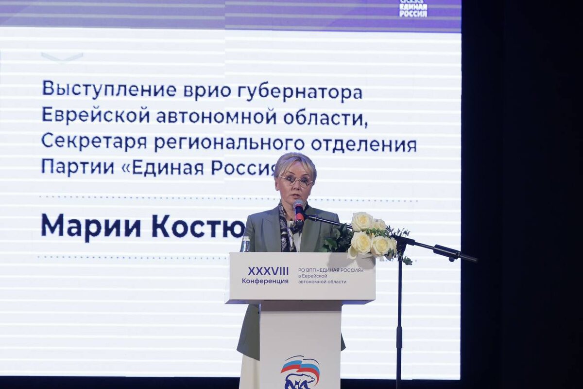 Мария Костюк выдвинута кандидатом «Единой России» на должность губернатора Еврейской автономной области Кандидатуру Марии Костюк выдвинули и единогласно поддержали на тайном голосовании делегаты XXXVIII партийной конференции. Мария Костюк, кандидат от «Единой России» на выборах губернатора Еврейской автономной области: «”Единая Россия” – партия Президента, которой доверяют жители нашей области. Этот высокий уровень доверия мы с вами заслужили реальной работой. Мы – все вместе – работаем над тем, чтобы жители нашей автономии почувствовали изменения к лучшему. Главная моя цель на этом посту – чтобы жителей в Еврейской автономной области становилось больше. Чтобы люди оставались в автономии, создавали семьи. Чтобы им было комфортно здесь жить, чтобы они могли достойно зарабатывать и реализовывать себя. И мы приложим все усилия для того, чтобы эта цель воплотилась». В партийной конференции приняли участие 166 делегатов. В их числе были волонтеры и участники специальной военной опер