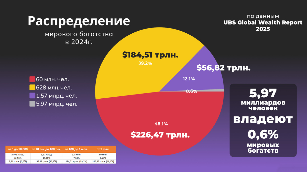 Вот такую пирамиду распределения мирового богатства мы имеем на 2025 год. И социальное расслоение на планете с каждым годом лишь усугубляется.