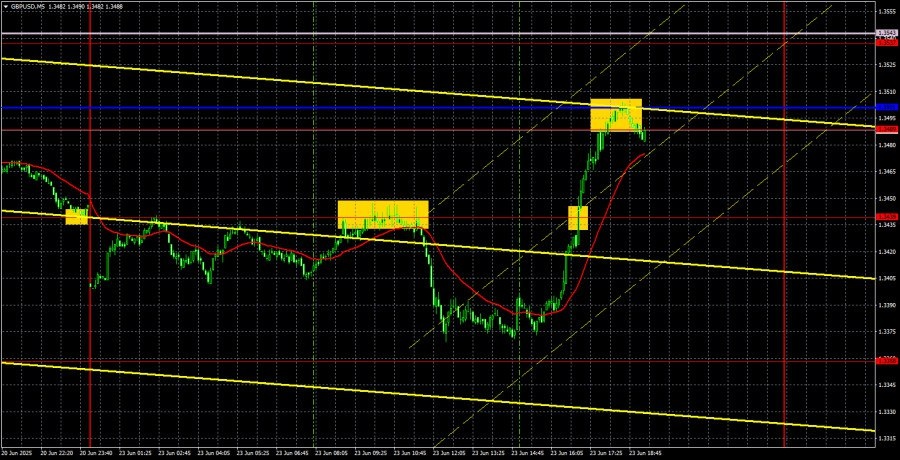https://basechop.ru/wordpress/?p=47583 Анализ GBP/USD 5М. Валютная пара GBP/USD в понедельник торговалась совсем не так, как от нее ожидали. Многие ждали либо сильного «взлета» американской валюты, либо же, напротив, сильного падения американской валюты, либо «американских горок» в течение дня. По факту же движения просто чередовались, но были достаточно плавными. Ночью доллар действительно подорожал, но подорожал очень слабо, а уже к открытию европейской торговой сессии растерял все преимущество. Затем на европейской сессии он вновь пользовался спросом, но уже на американской – начал стремительно терять позиции. Таким образом, по итогам дня можно с уверенностью сказать одно – никаких дивидендов из атаки США на Иран американская валюта не извлекла. К слову, падение доллара во второй половине дня никак не было связано с макроэкономической статистикой из-за океана. Доллар прекрасно падал еще до публикации далеко не самых важных индексов деловой активности в секторах услуг и производств